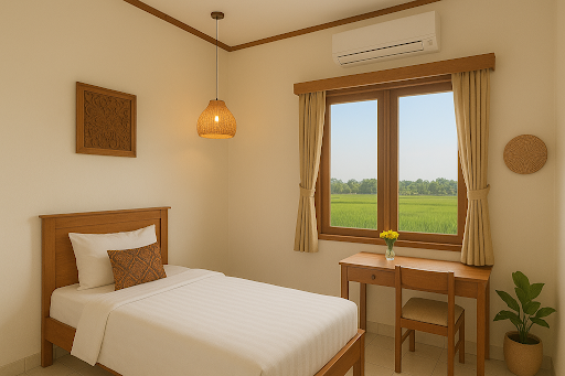 Pas untuk keluarga kecil atau tamu yang ingin kenyamanan lebih. Semua fasilitas Reguler Balkon pribadi dengan view sawah Area kerja/meja belajar Sarapan khas Jogja